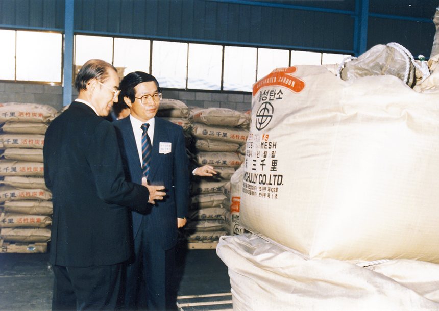 삼천리는 1980년부터 한국화학연구소와 활성탄 제조에 관한 연구를 공동으로 진행하며 활성탄소 사업을 준비했다. 1987년 1월부터 2년에 걸쳐 일본의 스미토모중기와 활성탄 제조 장치에 대한 연구를 진행하기도 했다. 연구 결과를 바탕으로 삼천리는 활성탄소 사업을 추진하기로 하고, 1989년 12월 12일 연산 2,500톤 규모의 고품위 활성탄소를 생산하는 제1기 활성탄소 제조공장을 준공했다.