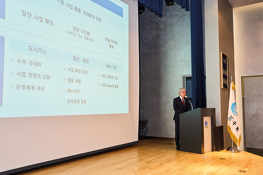이날 경영설명회에서 이찬의 부회장은 직접 연단에 올라 그룹의 경영현황을 프레젠테이션으로 설명하고, ① 기존 도시가스 사업의 잠재 수요를 확보함과 동시에 신규 사업을 적극 발굴하는 ‘신성장동력 발굴’, ② 안전의식을 제고하며 현장에서 기본과 원칙을 준수하는 ‘안전실행 강화’, ③ 그룹의 미래를 이끌 인재 육성 및 인재교육 강화, 조직 및 체계 혁신을 통한 ‘경영기반 구축’ 등을 2023년도 경영방침으로 제시했다. 신성장동력 발굴을 제1순위에 두고 강력히 추진하겠다는 것이다.